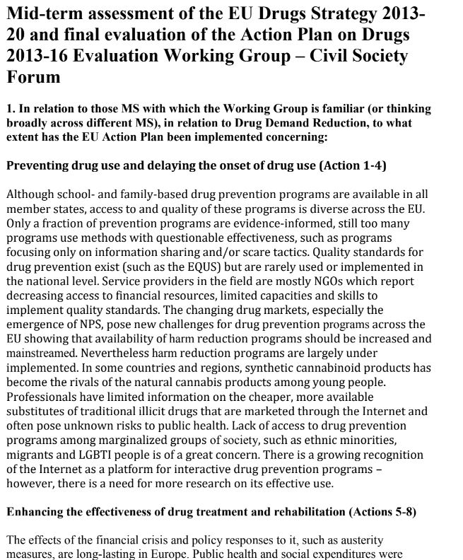 Mid-term assessment of the EU Drugs Strategy 2013-20 and final evaluation of the Action Plan on Drugs 2013-16 Evaluation Working Group –Civil Society Forum
