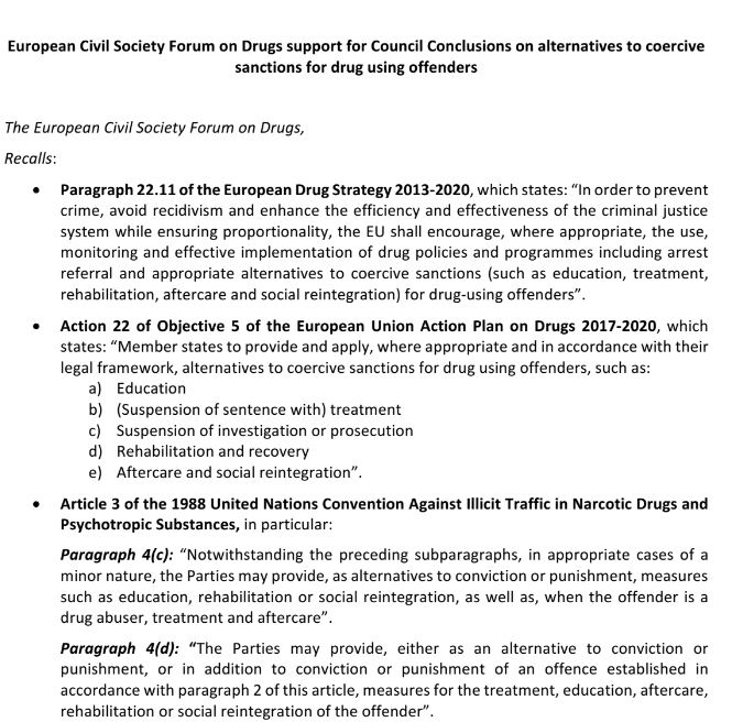European Civil Society Forum on Drugs support for Council Conclusions on alternatives to coercive