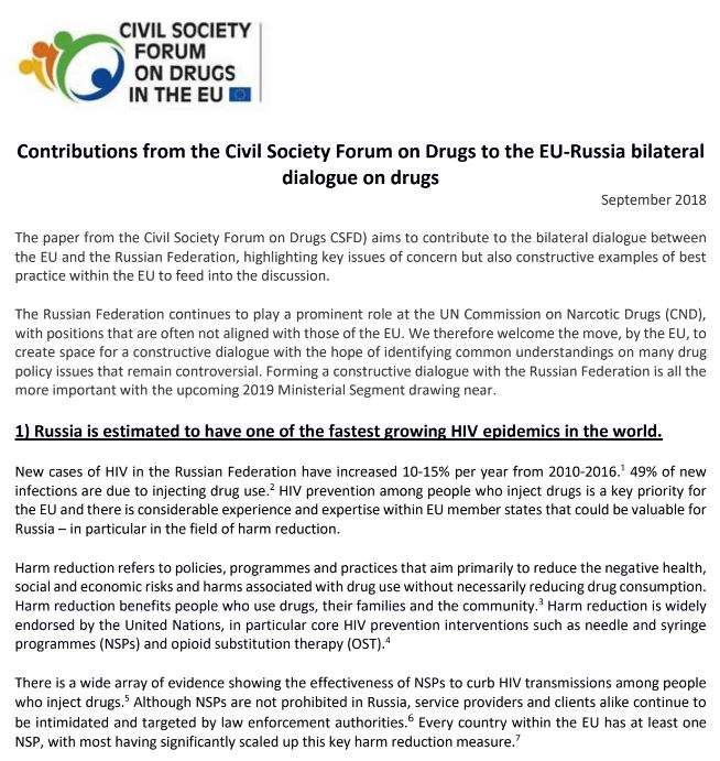 Contributions from the Civil Society Forum on Drugs to the EU-Russia bilateral dialogue on drugs 2018