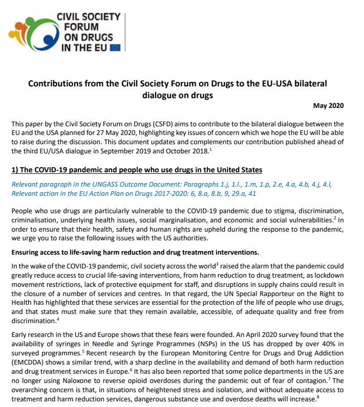 Contributions from the Civil Society Forum on Drugs to the EU-USA bilateral dialogue on drugs 2020