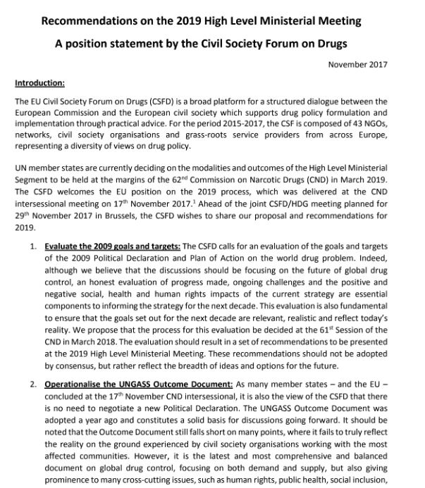 Recommendations on the 2019 High Level Ministerial Meeting A position statement by the Civil Society Forum on Drugs