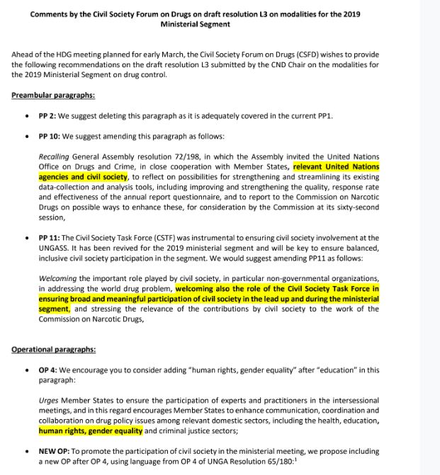 Comments by the Civil Society Forum on Drugs on draft resolution L3 on modalities for the 2019 Ministerial Segment